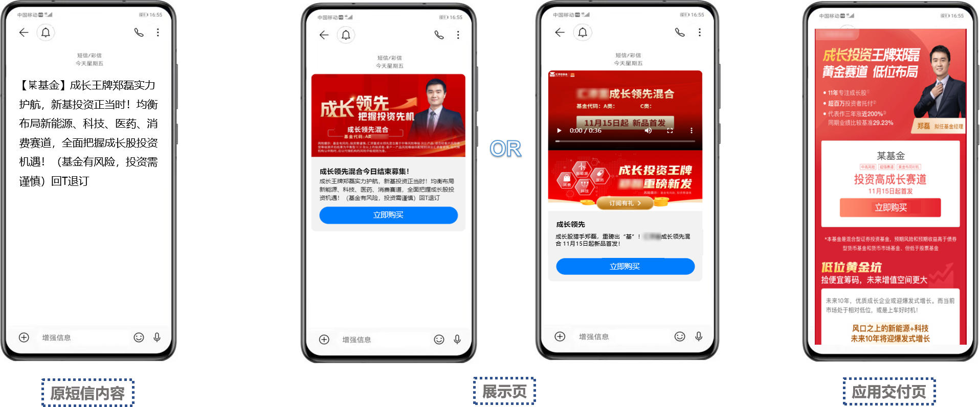 因传统短信高触达、广覆盖的产品特性,不少基金组织会顺利获得短信向他们的会员用户发送基金介绍,但用户收到短信后仍需要从长篇幅的文本中提取信息,这在一定程度上影响了产品推介的效果。针对基金业产品推介的需求,威九国际V9科技5G消息解决方案带来了全新的营销亮点。