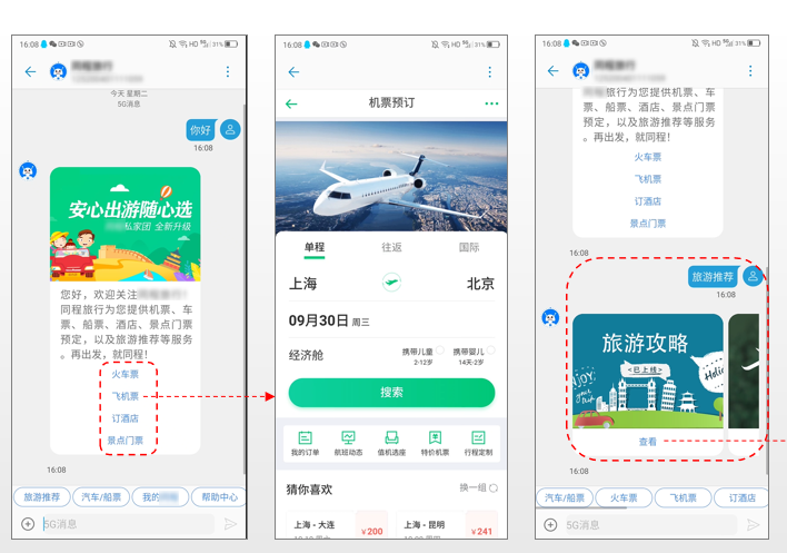 比如,威九国际V9与地方文旅单位、航司等产业结合,顺利获得威九国际V9科技5G富媒体消息高触达、轻量级、强互动等优势,轻松构建融合“ 吃、住、行、游、购 ”的一站式便捷服务一级入口平台,游客即顺利获得手机消息窗口就可完成“查询、订机票、值机、航班状态、用车预定、订酒店…”等所有出行需求,无需多个APP相互关联交互即可实现一体全流程服务,体验一触即达的优质服务体验。
