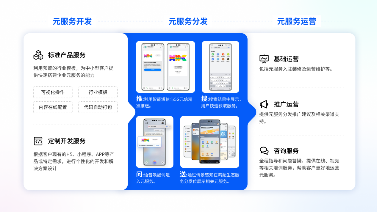 将服务送到用户身边,是软件生命力的前提。在进入HarmonyNEXT时,Harmony生态在原有的三大分发体系(游戏分发,应用分发,内容分发)的基础上,新增了服务分发的概念,并进一步集成了AI能力,能够合力实现精准、高效的服务分发,其中,元服务是服务分发的重要载体。
